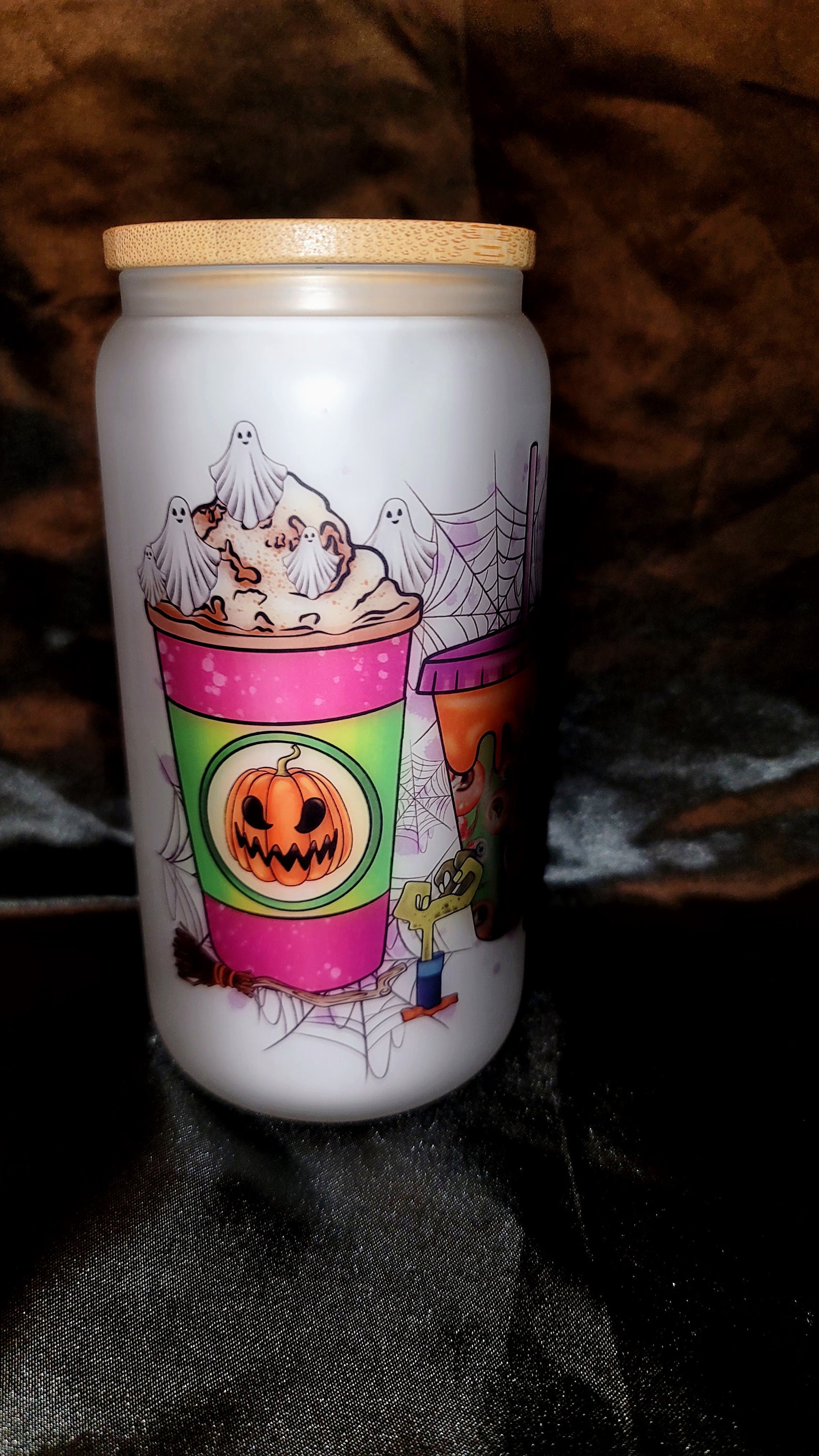 Four ghoulish coffee cups decorate this awesome, cute, seasonal drinking glass. It comes with a bamboo lid and a straw.