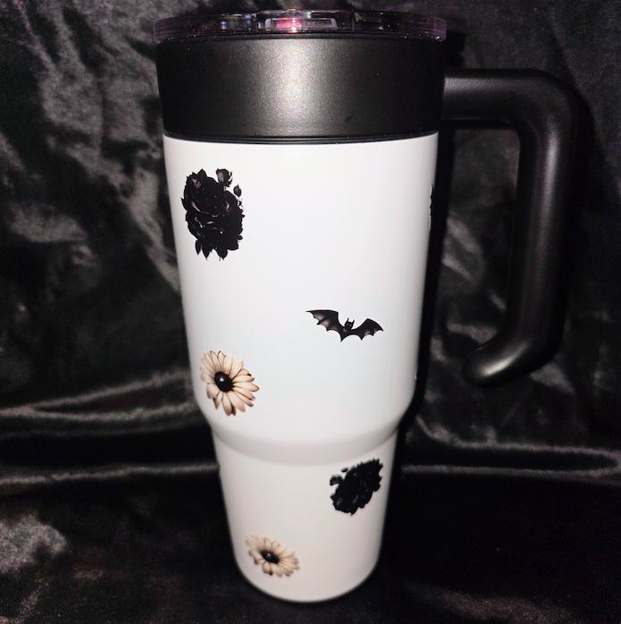 The adorable ghost on this tumbler is a UVDTF sticker. It holds 30 oz hot or cold.