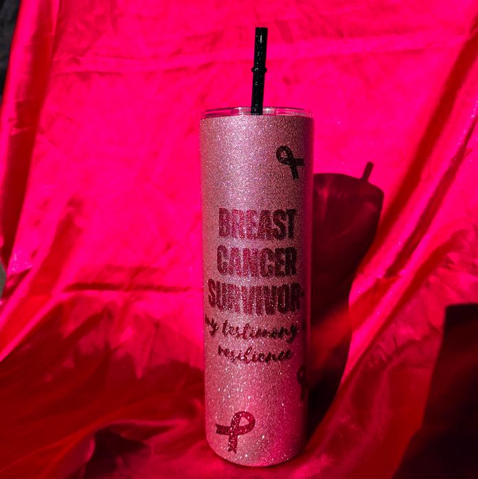 Fight like a girl! This glittery pink tumbler is decorated with the words "Breast Cancer Survivor: My Testimony is My Resilience" on both sides.