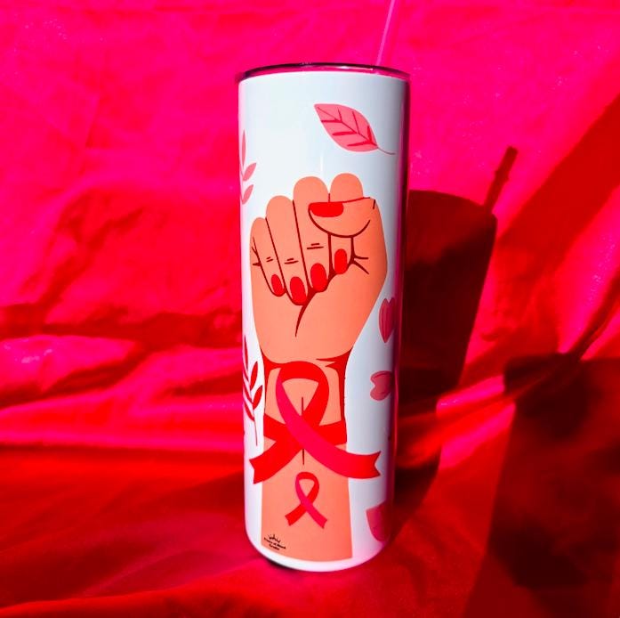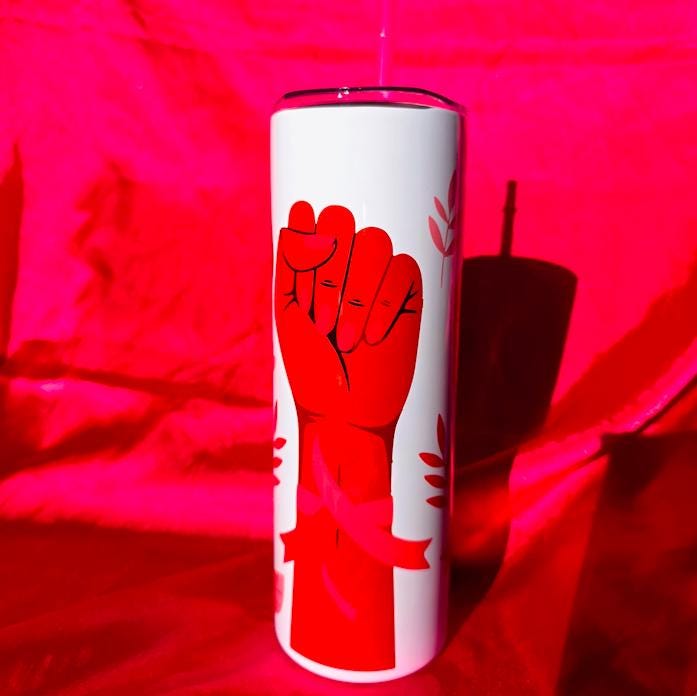 This tumbler is designed with three women's raised fists in triumph and decorated with various pink ribbons.