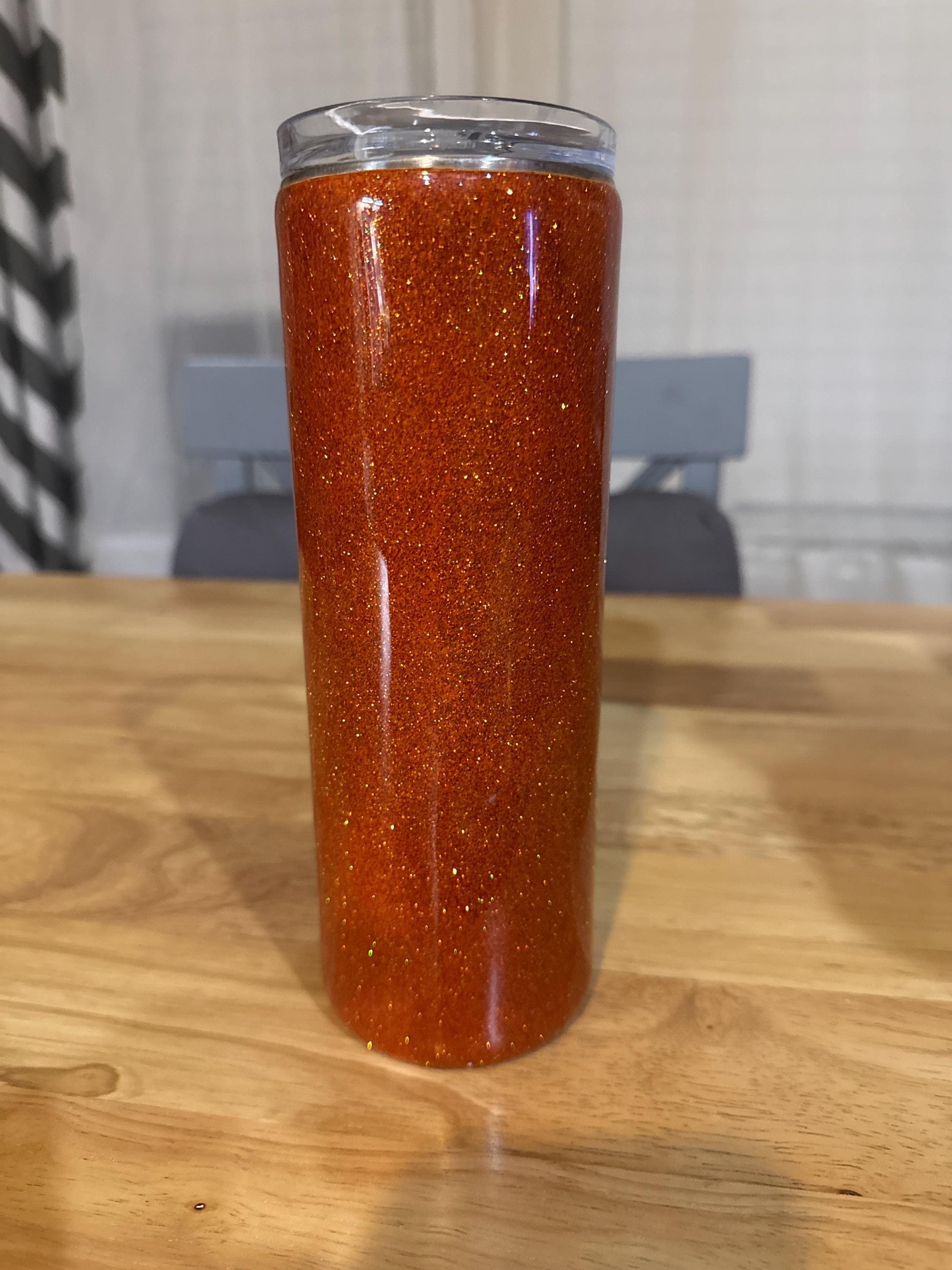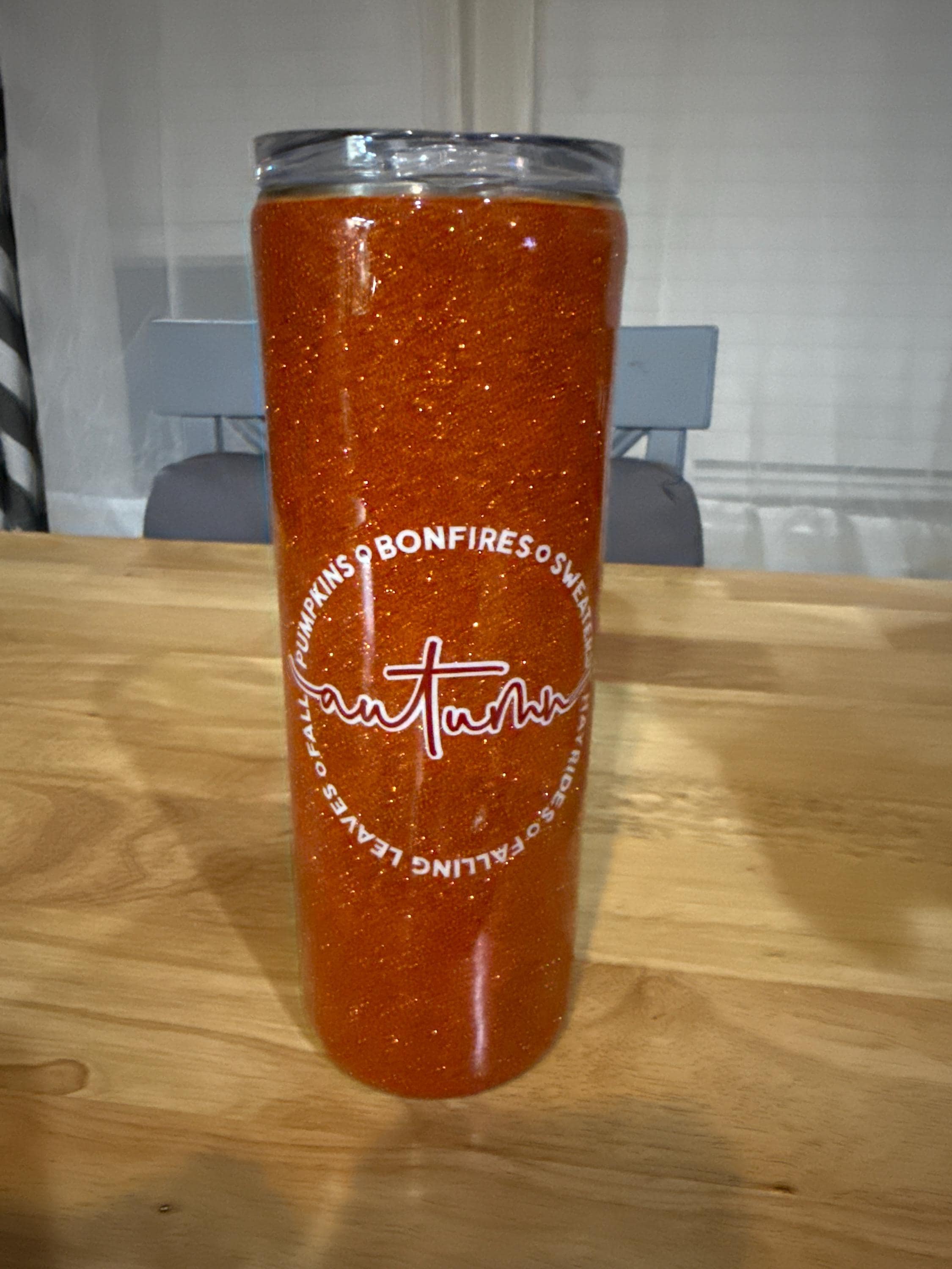 Do you love Fall most of all? Do you have any way of proving it? If not, this cup in your hand with the beverage of your choice will do the job. It has orange glitter and says "Pumpkins, Bonfires, Sweaters, Hayrides, Falling Leaves, Fall